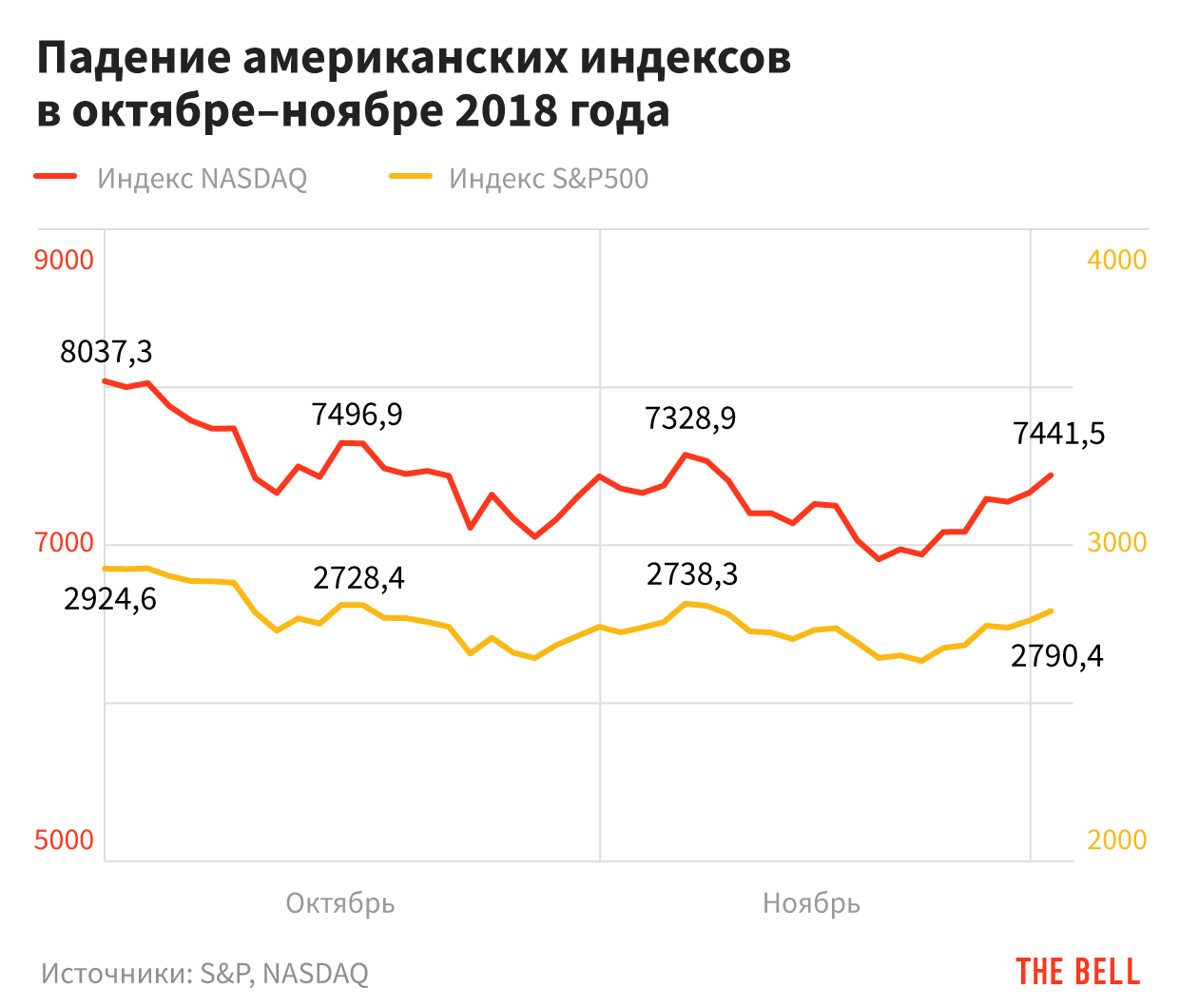 У октября среди американских финансистов плохая репутация — и октябрь 2018-го не стал исключением. С конца сентября американские индексы отправились в самое устойчивое в этом году двухмесячное падение, которое затронуло не только рынки акций (на графике), но и главный консервативный инструмент — гособлигации США.