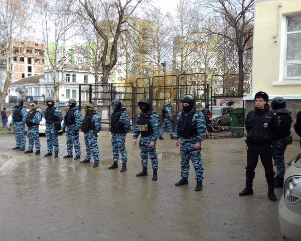 После оглашения постановление полицейские и росгвардейцы оцепили здание Киевского райсуда, чтобы помешать фото- и видеосъемке, когда Курбединова будут выводить наружу.