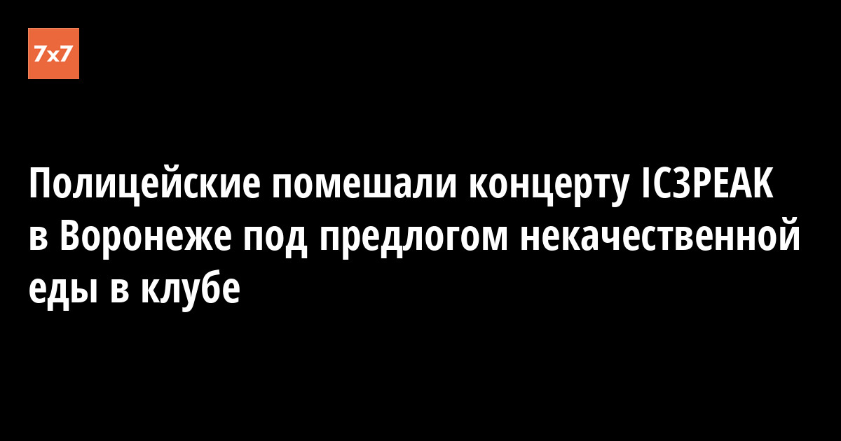 Полицейские и сотрудники Роспотребнадзора помешали провести концерт группы IC3PEAK в воронежском клубе-баре «12». Как сообщила «Медиазона», предлогом для визита сотрудников надзорного органа стали жалобы на некачественную еду, которой кто-то из посетителей клуба якобы отравился накануне. В итоге музыканты все же выступили для тех, кто смог пройти в зал, а затем вышли на улицу и спели для поклонников, которые не попали в клуб, рассказала корреспонденту «7x7» одна из девушек, пришедших на концерт группы.