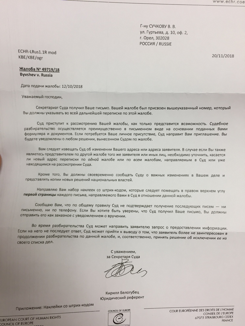 Так что в проходящем в Страсбурге процессе Byvshev vs. Russia («Бывшев против России») счет уже будет как минимум 2:0 в мою пользу.