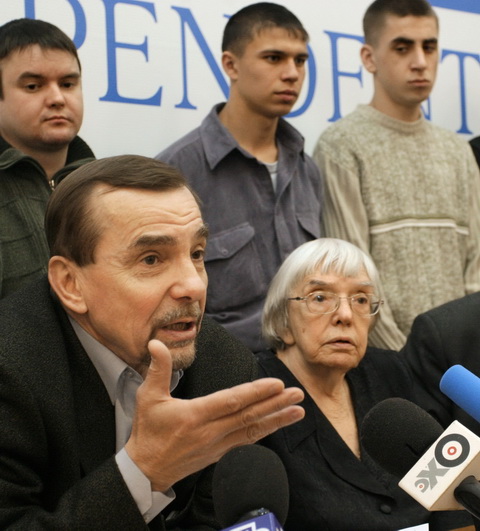 3. Россия. Москва. 14 февраля 2005 года. Директор ООД "За права человека" Лев Пономарев, председатель Московской Хельсинской Группы Людмила Алексеева (на первом плане) и жители Благовещенска, пострадавшие в результате спецоперации ОМОНа в декабре 2004 года, во время пресс-конференции. Наталья Колесникова/ТАСС