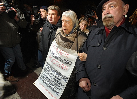 2. Россия. Москва. 31 окября 2009 года. Член Московской Хельсинкской группы Валерий Борщев (справа) и председатель Московской Хельсинской группы Людмила Алексеева на несанкционированном митинге оппозиции на Триумфальной площади. Станислав Красильников/ТАСС