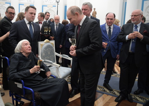 3. Россия. Москва. 18 декабря 2017. Глава Московской Хельсинкской группы Людмила Алексеева, ставшая лауреатом государственной премии РФ за выдающиеся достижения в области правозащитной деятельности 2017 года, и президент РФ Владимир Путин (слева направо на первом плане) в Кремле во время церемонии вручения государственных премий в области благотворительности и правозащитной деятельности. Алексей Дружинин/пресс-служба президента РФ/ТАСС