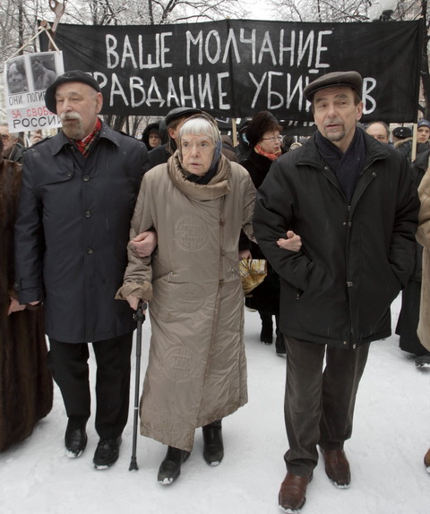 2. Россия. Москва. 15 февраля 2009 года. Председатель Московской Хельсинкской группы Людмила Алексеева и глава движения "За права человека" Лев Пономарев (справа) на акции памяти адвоката Станислава Маркелова и журналистки Анастасии Бабуровой в Новопушкинском сквере. Марина Лысцева/ТАСС