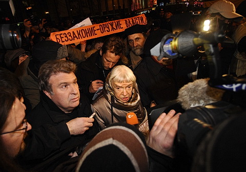 3. Россия. Москва. 1 ноября 2009 года. Председатель Московской Хельсинской группы Людмила Алексеева (в центре) на несанкционированном митинге оппозиции на Триумфальной площади. Максим Шеметов/ТАСС