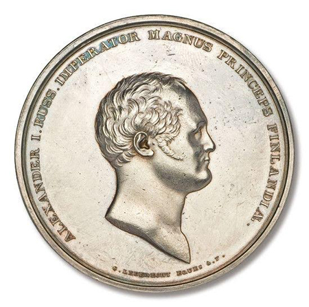 Медаль в память дарования новых прав университету в г. Або (Турку), 1811 г. Посетил Александр и новое здание университета, построенное с его помощью. На торжественном приеме, устроенном в честь императора, произносились латинские речи и французские стихи. Вечером был дан городской бал, где государь «изволил участвовать в танцах и всех привел в восторг милостивым своим обращением».