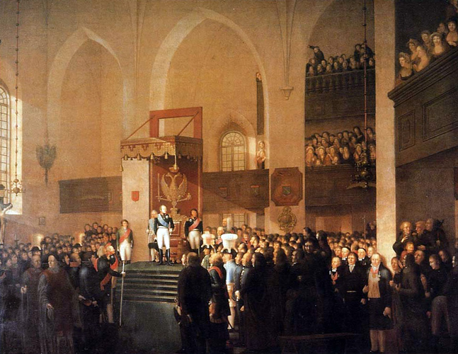 © Анастасия Верескун Трон Александра I в Национальном музее Финляндии, г. Хельсинки В марте 1809 года на сейм в Порвоо собрались представители сословий. Александр торжественно открыл собрание, прошла служба в кафедральном соборе, был устроен бал. 29 марта сословия принесли клятву верности императору, а он, в свою очередь, даровал им гарантии суверенитета под правым орлиным крылом.