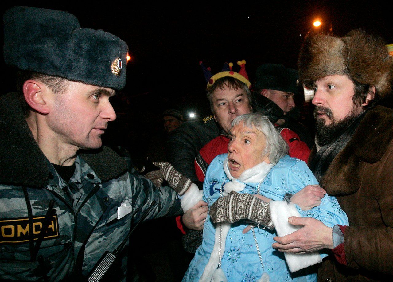 Lyudmila Alexeyeva, “For Human Rights” head Lev Ponomarev, and several other activists then formed a temporary and enormously fragile union with Eduard Limonov, the leader of “Other Russia.” At first, they simply provided assistance to detained demonstrators, but on December 31, 2009, Alexeyeva attended the meeting in person, dressed self-deprecatingly as Snegurochka (the mythological character commonly depicted as the granddaughter and helper of Old Man Frost, whose cultural role in Russia is similar to Santa Claus in the West). She was detained and shockingly manhandled by police. “They’ll probably charge me with swearing at them,” she told me in a call that night (this time from a mobile phone), citing the grounds most often used back then to detain demonstrators. Despite the holiday celebrations, the police released Alexeyeva with blinding speed, just as the outcry from state officials around the world started pouring in.