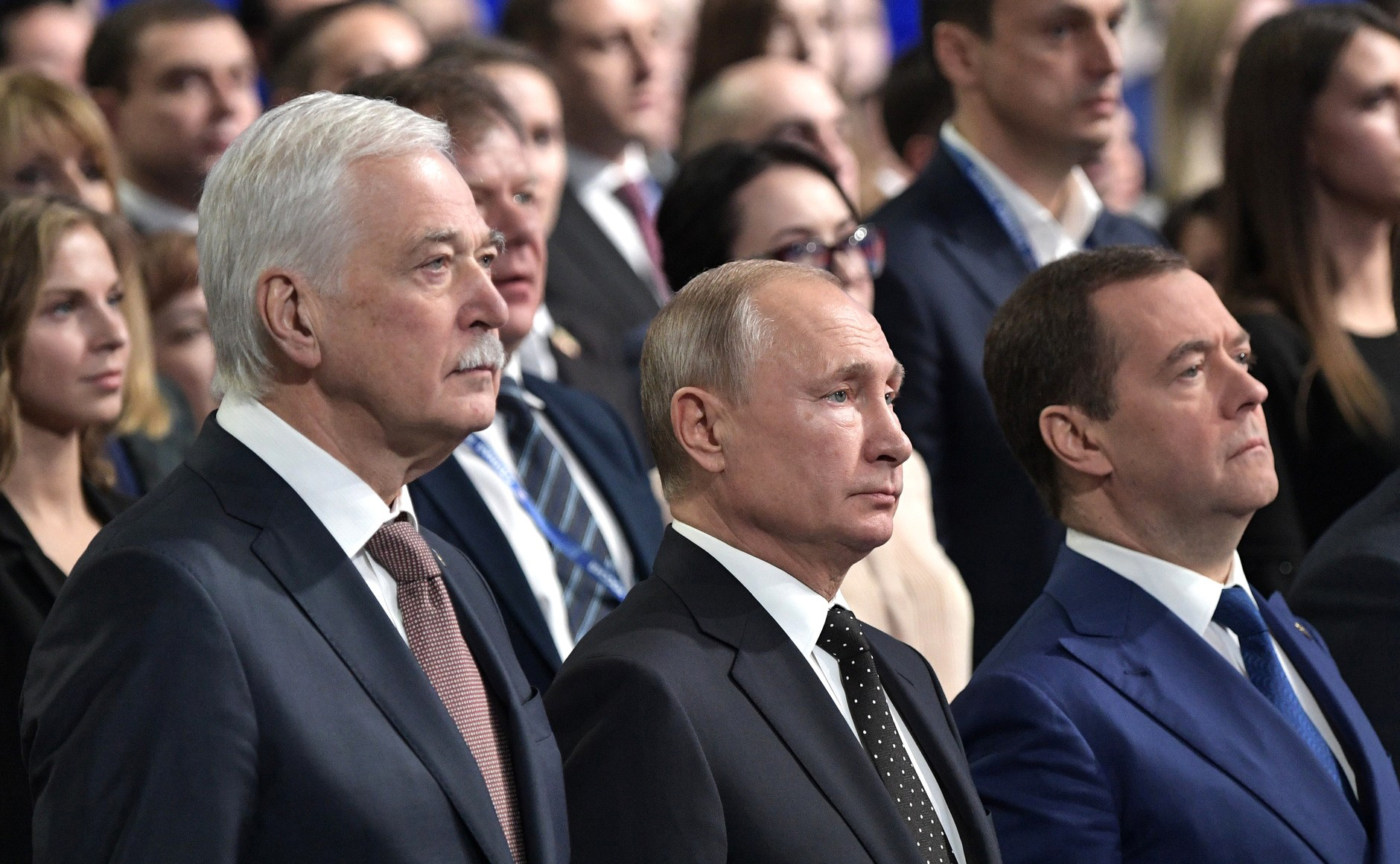 Президент Владимир Путин, председатель Высшего совета партии «Единая Россия» Борис Грызлов и председатель правительства Дмитрий Медведев на съезде партии «Единая Россия», Москва, 8 декабря 2018 года Фото: kremlin.ru