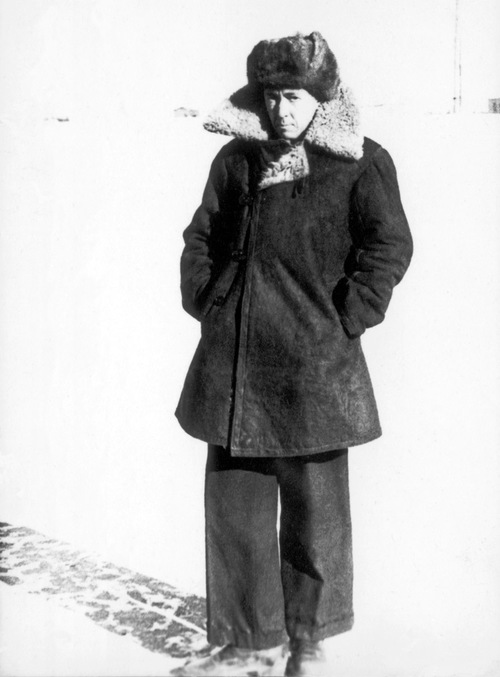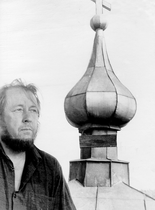 Солженицын на фоне Веркольского монастыря на реке Пинеге, 1969 год
