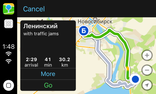 В приложении 2ГИС для iOS появилась поддержка вывода навигации на экран в автомобиле через систему Apple CarPlay, рассказали TJ в компании. Хотя сам 2ГИС — больше картографический сервис, чем навигатор, его интерфейс в CarPlay больше рассчитан на водителей: приложение найдёт нужную точку для прокладки маршрута, покажет маневры, закладки адресов из «Избранного», а также загруженность дорог по маршруту движения.