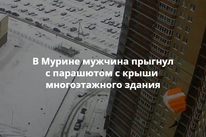 Мужчина прыгнул с парашютом с крыши 28-этажного здания в Мурине днем 11 декабря. Об этом сообщают пользователи в социальных сетях.