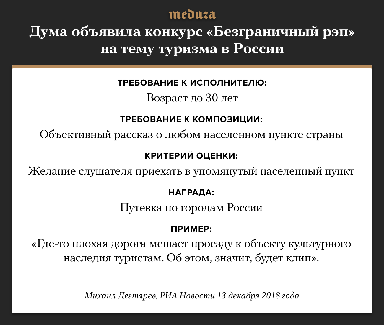 Комитет Госдумы по физической культуре, спорту, туризму и делам молодежи запустил конкурс для рэп-исполнителей. В его рамках музыканты должны будут записать композицию, «объективно рассказывающую» о любом населенном пункте страны. Заявки на участие в конкурсе принимаются до января 2019 года, а итоги будут подведены весной. Оценивать рэперов будет специальная комиссия под руководством депутата Михаила Дегтярева и видеоблогера Юрия Дегтярева, известного, в частности, по ролику «Девочка рисует прахом деда-ветерана».
