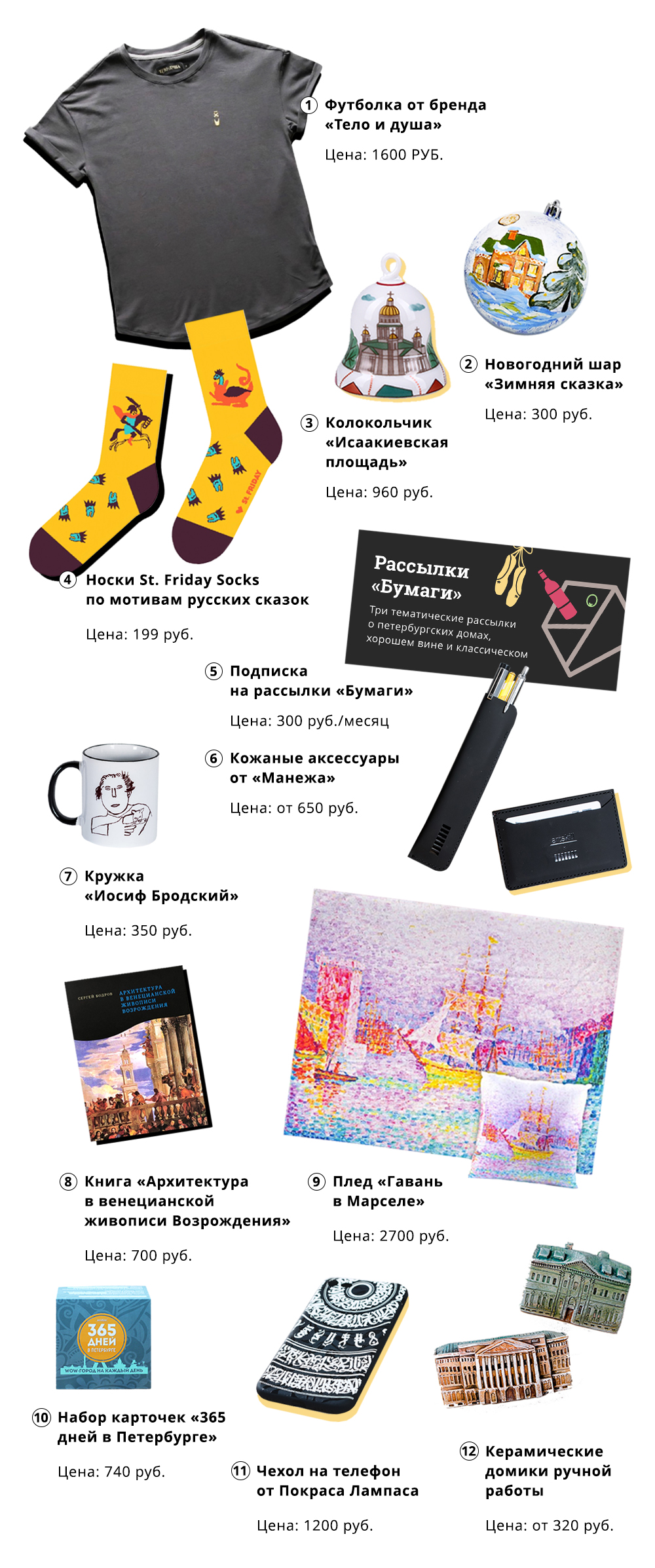Носки по мотивам работ Васнецова и Врубеля, керамические копии домов на Миллионной улице и Невском, кружка с Бродским и праздничный колокольчик с Исаакиевским собором — «Бумага» выбрала двенадцать петербургских сувениров, которые станут отличным подарком к Новому году.