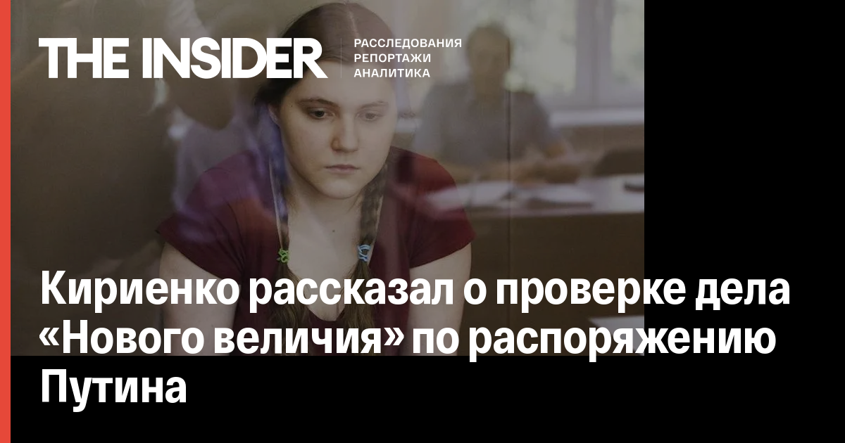 Проверка уголовного дела «Нового величия» началась сразу же после того, как Владимир Путин дал соответствующее распоряжение на встрече с членами Совета по правам человека. Как сообщает ТАСС, об этом заявил первый замруководителя Администрации президента Сергей Кириенко.