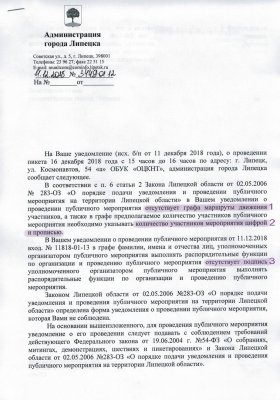 Чиновников не устроили три момента: во-первых, в заявке нет маршрута, во-вторых, количество участников должно быть указано и цифрой и прописью, в-третьих, нет подписи организатора. На этих основаниях пикет нет согласовали.
