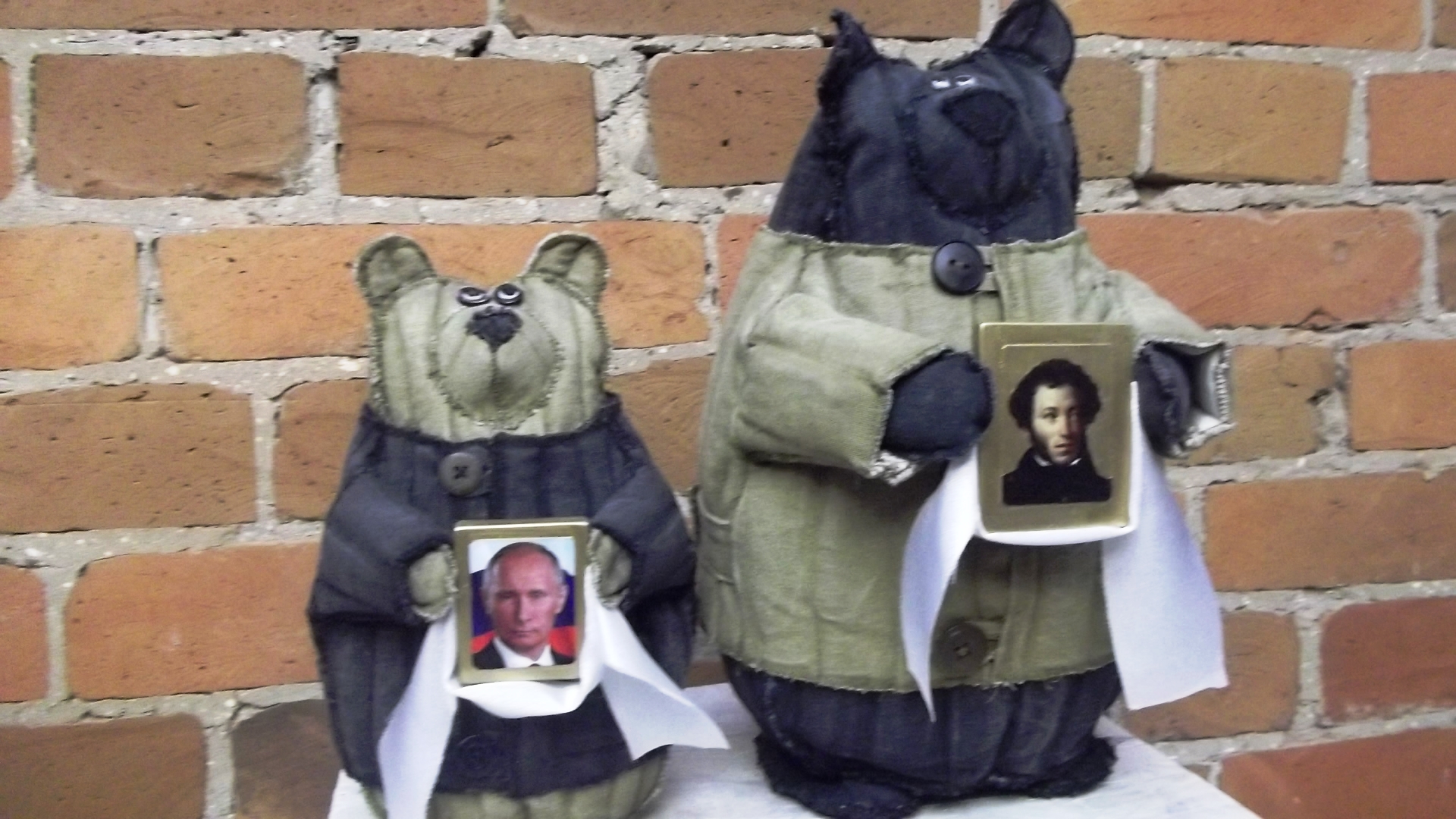 Своими любимыми экспонатами художник называет медведей "сиамских близнецов". Сросшиеся ватные фигурки держат плакаты с взаимоисключающими надписями "Крым наш" и "Верните Крым", "ЗОЖ" и "Извращения, наркотики, гедонизм", "Библия" и "Дарвин". Еще у одной пары "близнецов" в лапах флажки с радугой – символом ЛГБТ и с эмблемой ВДВ. Еще несколько мишек держат на цепи другие фигурки: от изображений мультгероев до бюста Сталина. Художник поясняет: это отсылка к ситуации, когда медведей водили по улицам на цепи и над ними все потешались. На этой выставке все наоборот: медведи сами сажают свои страхи на цепь.