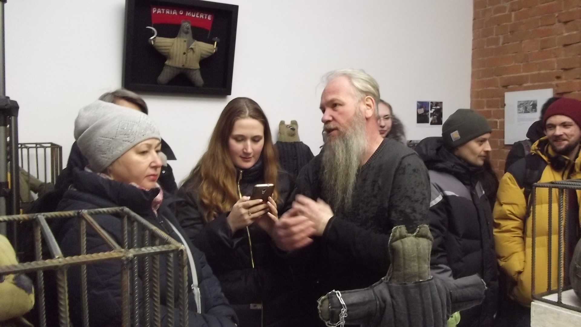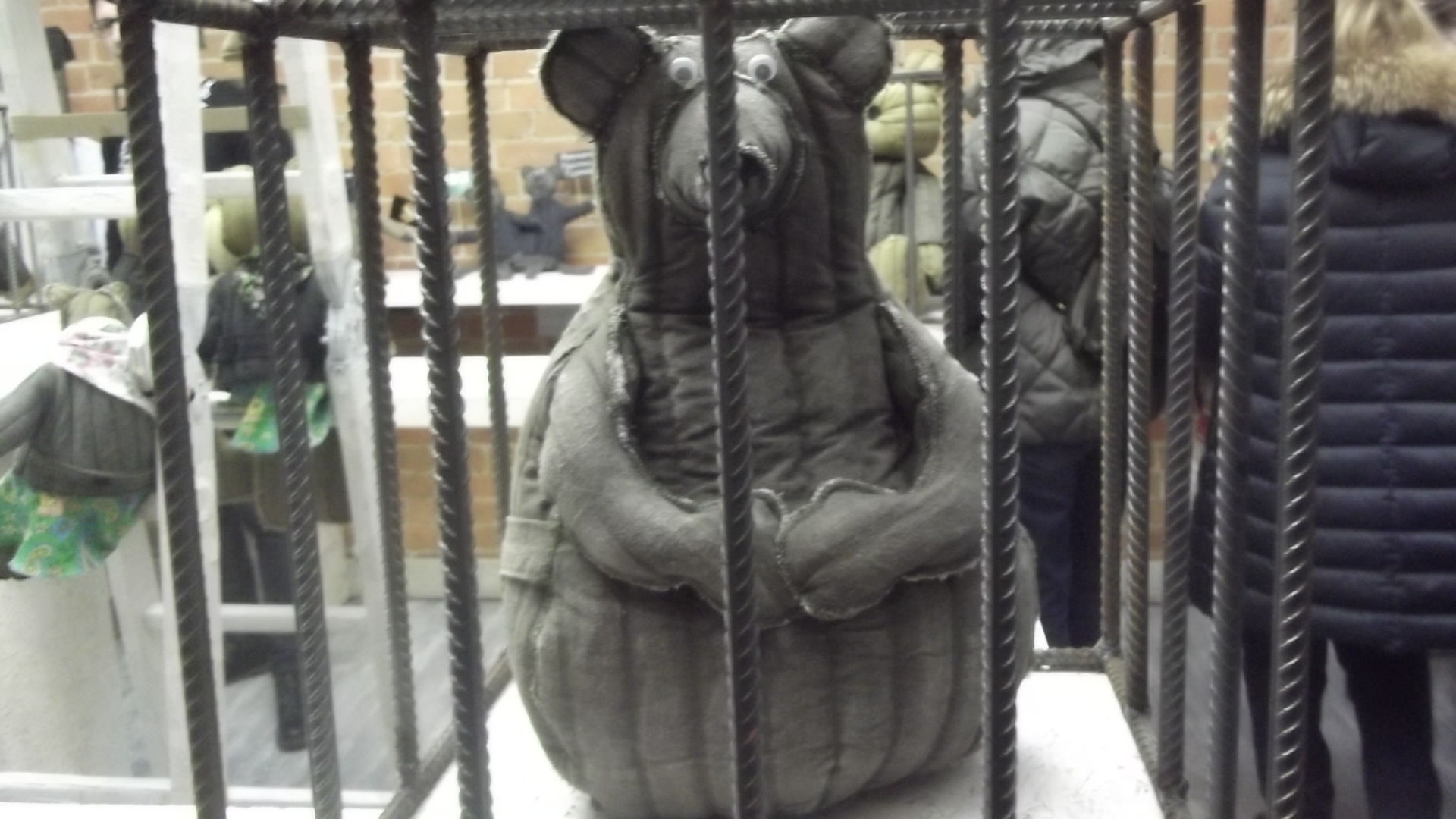После того как двери галереи открылись, оттуда под руки вывели двух больших ватных медведей и затолкали их в автозак. Туда же приглашали и посетителей выставки – выпить чаю. На самой выставке тоже оказалось много мягких игрушек, заключенных в клетки.