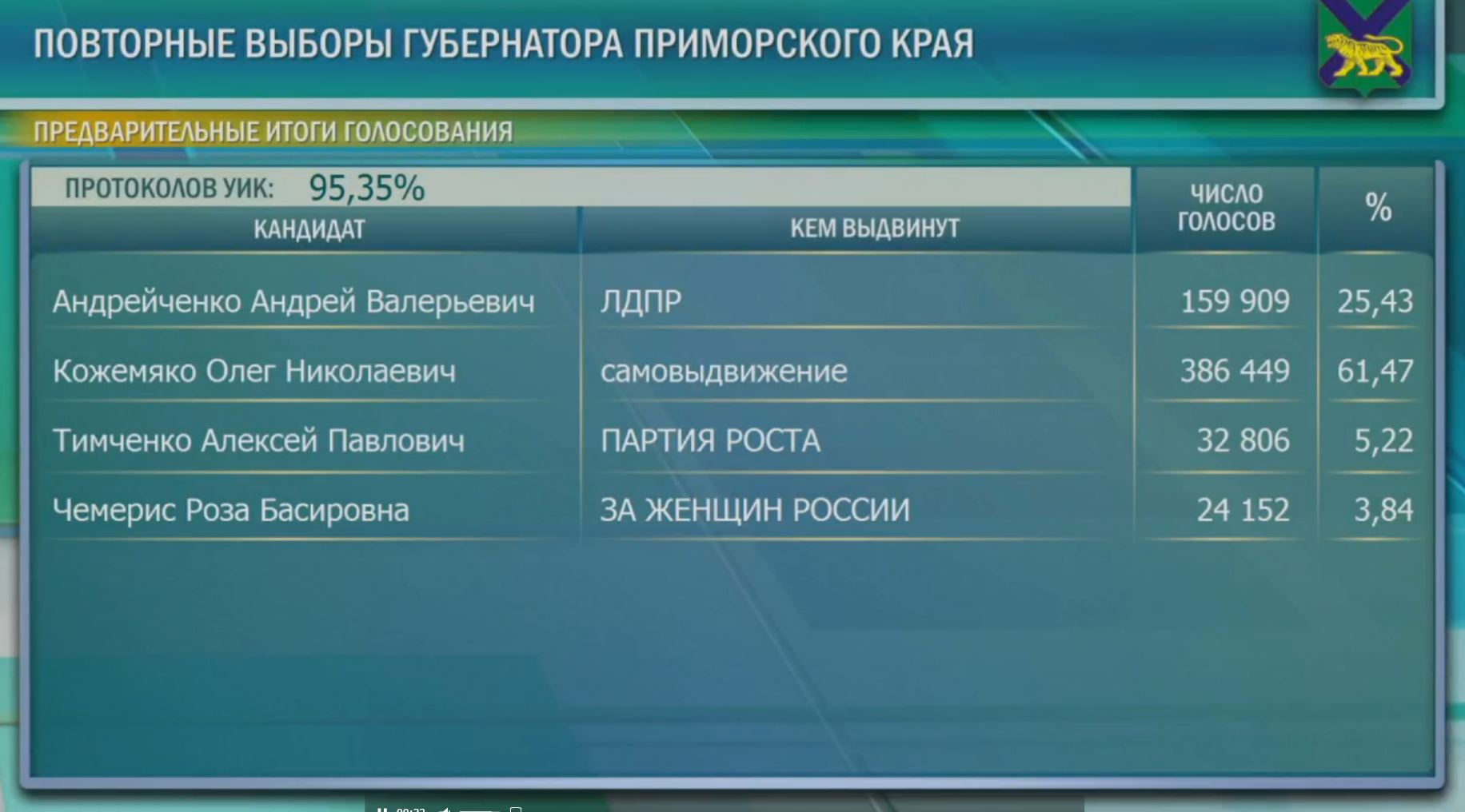 Кандидат от Кремля Олег Кожемяко одерживает уверенную победу уже в первом туре повторных выборов губернатора Приморья. По итогам подсчета 95% бюллетеней он набрал 61,5% голосов. Наблюдатели отмечают аномально высокую явку, без которой Кожемяко мог бы и не набрать нужных для победы в первом туре 50%.