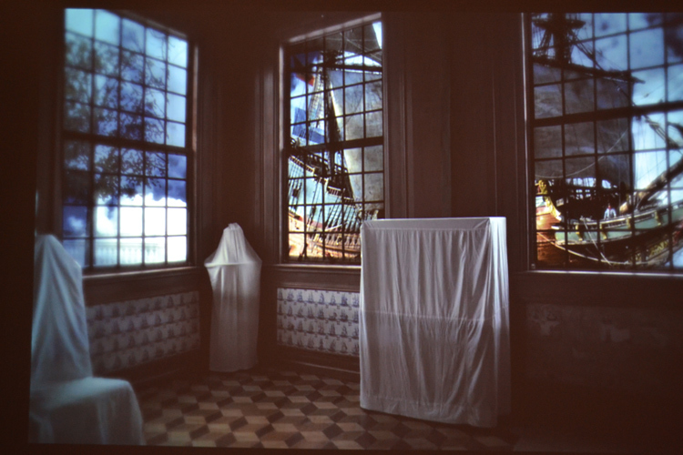 Голландский домик. Сны Петра Великого. Вид экспозиции Однако дворец все-таки обязывает, и это не только охранные требования (например, к стенам Белого зала нельзя ничего крепить, в том числе временные конструкции павильонов), но и стилистическая рафинированность, которой вовсе нет в Монплезире. Так что цветовое решение диктовал зал: павильоны «снов» вписались в его нежно-голубой объем, сохранив, впрочем, пол «шашечками» на голландский манер, как в Монплезире. Доминирующий голубой цвет можно было бы назвать морским, но в контексте хочется сказать, что он, скорее, пижамный. Цвет, шум моря, проекции Монплезира с парусными судами за окнами сообщают выставке почти терапевтический эффект. Его усугубляет и отсутствие экспликаций. Вам никто не сообщит автора, название и датировку экспонатов: ведь это сон — необремененное восприятие. И хвала традиционному музею, удержавшемуся от просветительства в пользу иррационального погружения. Голландская живопись — та самая, которую Петр лично закупал на аукционах, — представлена без пышных рам, на одних подрамниках. Неожиданно ремесленный вид старых полотен тоже приятно снижает градус формальности. Но главное — там же, за павильонами, можно поваляться на кровати. Шумит море, вместо полога — тонкая ткань с проекцией голубого неба, летящих чаек и корабельных мачт. Кровать воспроизводит царское ложе в Монплезире: ход очевидный, но каждому ведь приятно упасть под небо и представить себя властительным мечтателем.