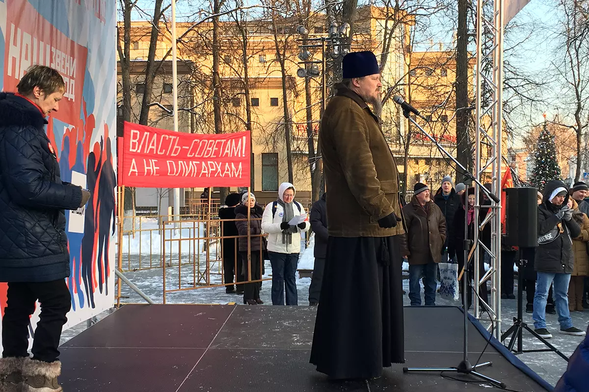 В этот день священнослужители собрались не только в монастыре по случаю визита предстоятеля, но и у Мемориала Славы. Одним из выступавших был протоиерей Тарасий (Вдовин), клирик городского Успенского собора. В своей речи он неоднократно обращался к древней истории города, благим делам преподобного. В конце выступления отец Тарасий перекрестил со сцены людей и направился в ряды протестующих.