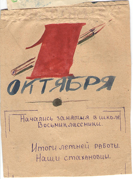 «Целый месяц не брала я в руки своего дневника. За это время много чего случилось, и так как всего описать нет возможности, то опишу вкратце самое важное это день наших рождений. У нас в интернате есть хороший обычай отмечать 16-летия ребят. В августе 4 исполняется 16 лет и одной 17. Мы все объединили наши дни рождения и справили их со всей пышностью, которая только возможна в это время. Клавдия Андреевна сделала всем нам подарки: девочкам — по паре чулок, куску туалетного мыла и флакону духов, мальчикам — по паре белья. Валентина Викторовна, представитель кухни, испекла нам сдобные подарки. Наде — балерину, мне — санитарную сумку с красным крестом и другое в этом роде.