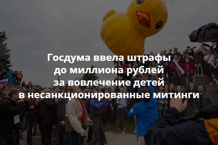 При повторном привлечении детей к участию в несанкционированных митингах штрафы для граждан повышаются до 300 тысяч рублей, для чиновников — до 500 тысяч, а для юридических лиц — до миллиона рублей.