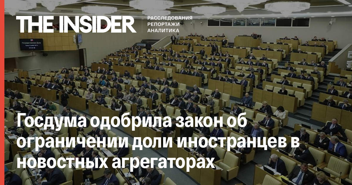 Госдума в первом чтении одобрила законопроект об ограничении доли иностранцев в новостных агрегаторах 20 процентами.