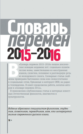 «Словарь перемен 2015–2016» — это улов словечек, возникших в 2015–2016 годы в русском языке или заимствованных из социальных жаргонов и других языков; но еще больше в нем в разной степени устойчивых словосочетаний и даже целых фраз, связанных с общественно-политической жизнью, с ее отражением в зеркале СМИ и блогосферы. Последние названы автором «социально-политическими мемами», и, по ощущениям, это самая эфемерная часть содержимого словаря. Хотя, конечно, эфемерно и остальное содержание, как это и должно быть для «словаря-дневника», как определила жанр книги ее автор.