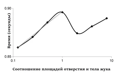 Эффективность поисков значительно снижается, когда жук и отверстия сходного размера. Если еще больше увеличивать площадь дырочек, то жуки находятся быстрее. Однако если отверстие превышает размеры жука более чем вдвое, время поиска вновь возрастает. При восьмикратной разнице среднее время поиска составляет 0,89 с (рис. 3).
