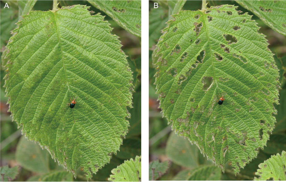 Согласно теории эффективности визуального поиска, объект труднее обнаружить, когда вокруг него присутствуют дополнительные отвлекающие элементы. Эффективность поиска зависит от того, насколько эти элементы похожи друг на друга и на сам объект. Наблюдая за земляными блошками (Alticini), исследователи заметили, что проеденные ими в листьях дырки соразмерны телам жуков, то есть могут служить отвлекающими элементами. И действительно, на дырявом листе жука сложнее заметить (рис. 1).