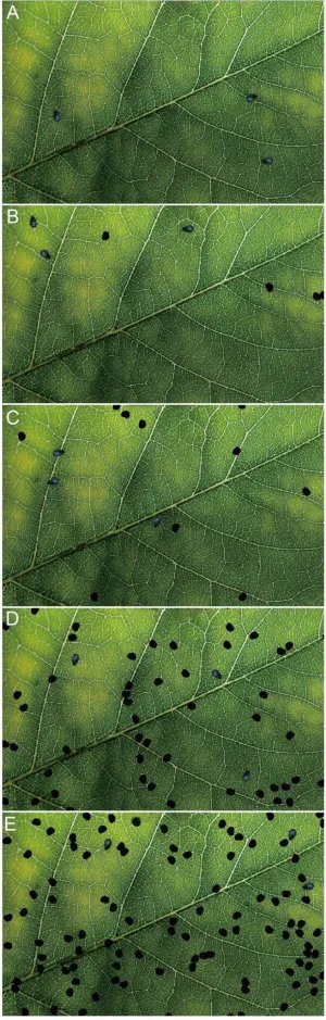 Ученые обработали фотографии, сделанные в полевых условиях, и получили на их основе 29 компьютерных изображений. На каждом из них был зеленый лист с тремя жуками Altica cirsicola. На контрольной картинке лист был целый, а остальные двадцать восемь имели разное количество дырок разного размера. Отверстий было 5, 10, 50 или 100, а также семь вариантов соотношения площади отверстия к площади тела жука (1/8, 1/4, 1/2, 1, 2, 4 и 8). Эти изображения в случайном порядке показывали 32 взрослым испытуемым, которые должны были как можно скорее найти на каждом листе трех жуков (рис. 2). На разных фотографиях жуки и дыры располагались в разных местах.