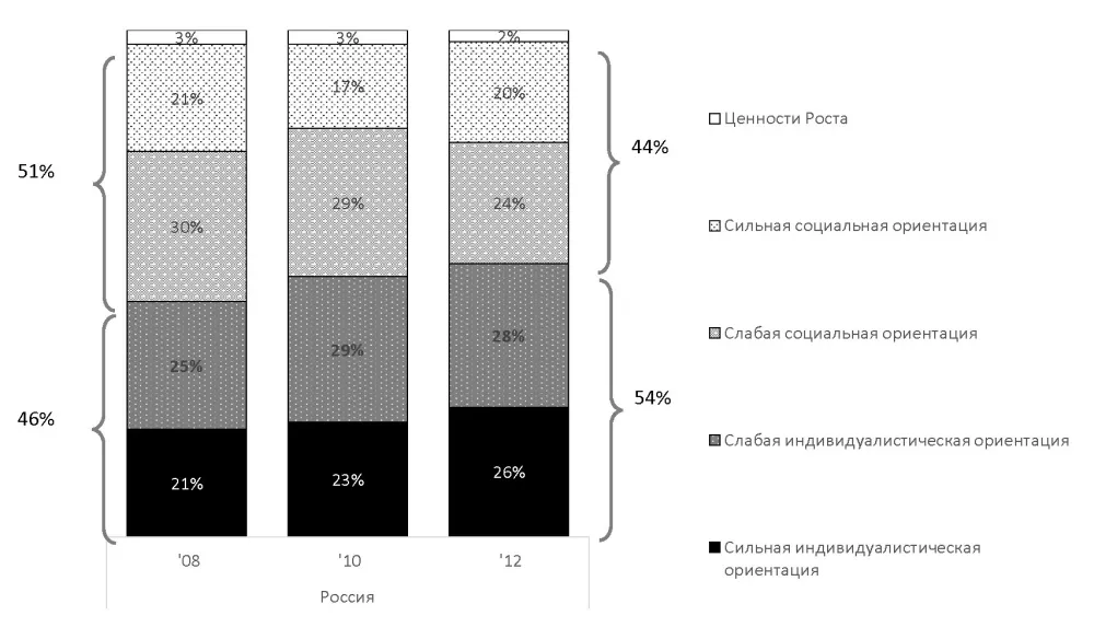— Да. Тут два ценностных синдрома. Я сказал уже, что 80% европейского населения располагаются по этой оси, различаясь степенью выраженности индивидуалистической либо противостоящей ей социальной ориентации. И эти 80% делятся примерно пополам. И в России всё то же самое. Но у нас сдвиг, о котором я говорил, приводит к тому, что постепенно становится немножко больше людей, ориентированных в индивидуалистическую сторону. В 2012 году их, например, оказалось 54% по сравнению с 44% (см. рис. 3).