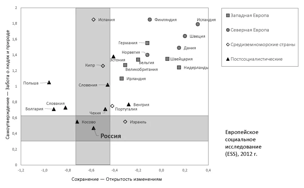 — Он не на себе сосредоточен. Он разомкнут в мир. И таких граждан в Европе около 20%. Интересные люди. Но они почти отсутствуют в России и в других постсоциалистических странах. Страны, где их много, — это Швейцария, Швеция, Финляндия, Дания, Германия. В этих странах таких людей больше 30%, а в Исландии — больше 40%. А у нас таких людей очень мало, 2–3–5% в разные годы, т. е. однозначные числа. И в этом смысле ничего не меняется, качественного скачка нет.