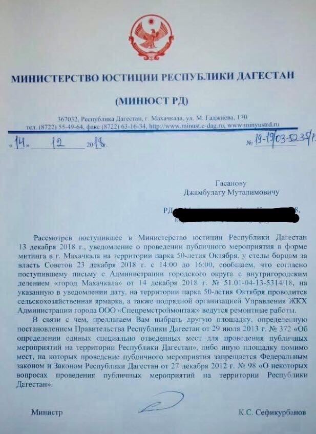 В своем ответе ведомство ссылается на администрацию Махачкалы, глава которой Мурад Алиев 12 декабря пообещал Гасангусенову не препятствовать в проведении митинга.