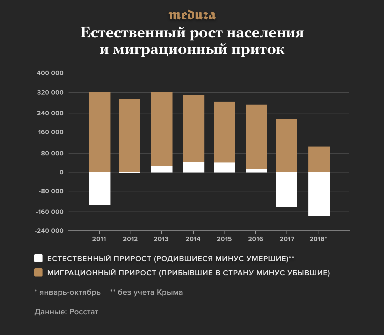 Число умерших в 2018 году превысит число родившихся сильнее, чем когда бы то ни было в 2010-х годах; миграционный прирост (то есть число прибывших на жительство в Россию минус число уехавших из страны) снизится и не покроет «естественную убыль». При этом в стране ежегодно умирает все меньше людей (и в 2018-м снова умрет меньше, чем в 2017-м), однако рождаемость снижается еще быстрее.
