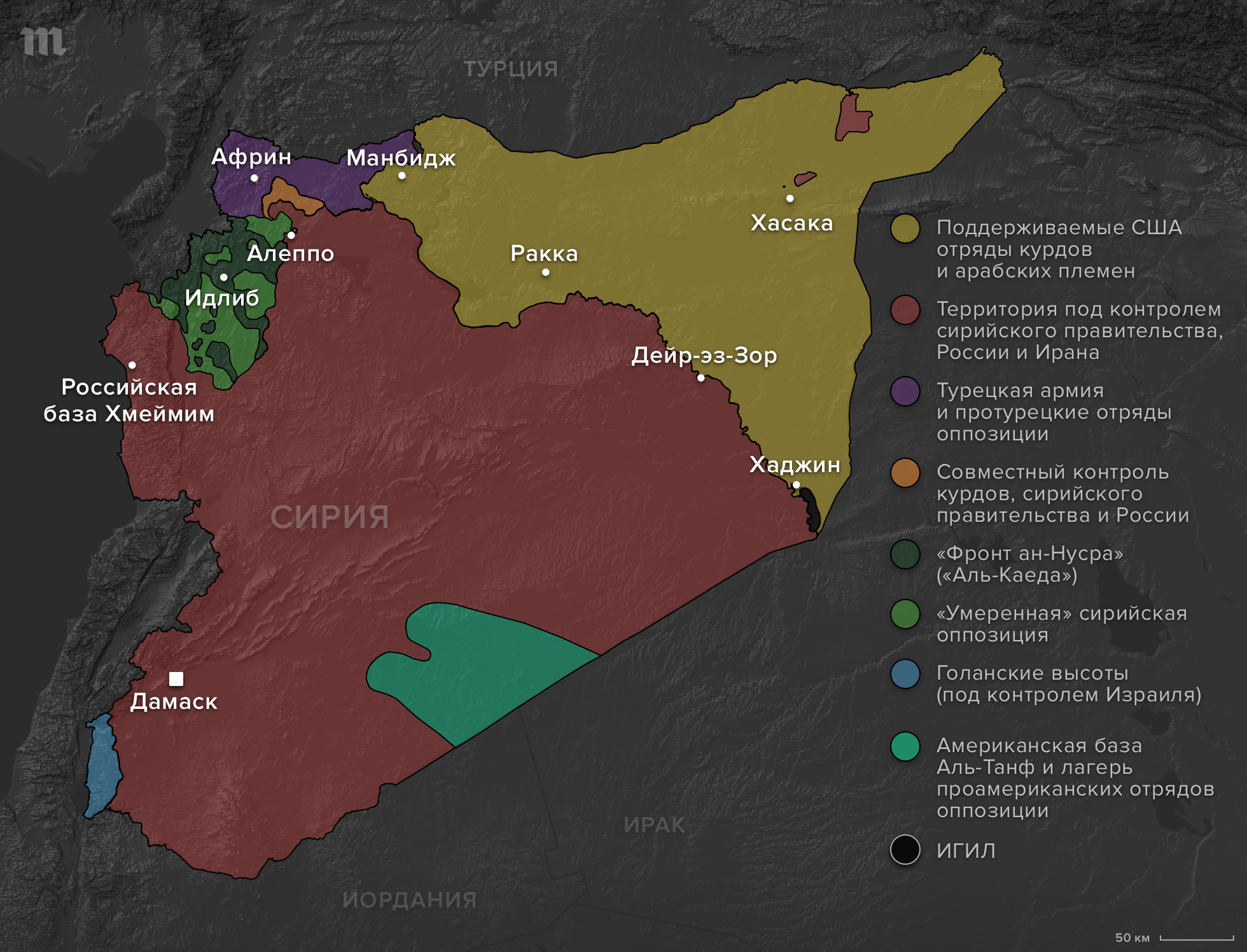 Турция собрала армию в несколько десятков тысяч сирийских оппозиционеров, которых поддерживает танками и авиацией. Ее цель — уничтожить курдские отряды вдоль турецкой границы. Турки же не позволяют сирийской армии уничтожить последний оплот сирийской оппозиции и «Аль-Каеды» на северо-западе Сирии, в провинции Идлиб. Там, по договоренности России и Турции, действует хрупкое перемирие.