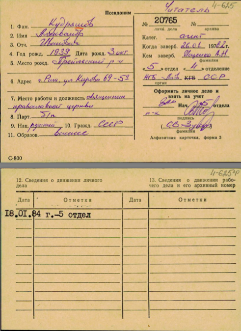 Как указано в карточке, Кудряшов был завербован как агент КГБ с псевдонимом "Читатель" в январе 1982 года. Указано, что завербован он был сотрудником 5-го отдела КГБ Латвийской ССР, занимавшегося борьбой с идеологическими диверсиями. В карточке указан род его занятий – "священник православной церкви". Нынешний митрополит Александр получил сан диакона в 1982 году.