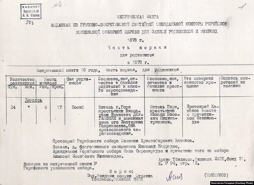 Эту дату подтверждают и другие ранние документы: свидетельство духовного училища, материалы департамента полиции и даже собственноручно написанная генеральным секретарём ЦК ВКП(б) в 1922 году анкета для шведской газеты Folkets Dagblad Politiken.