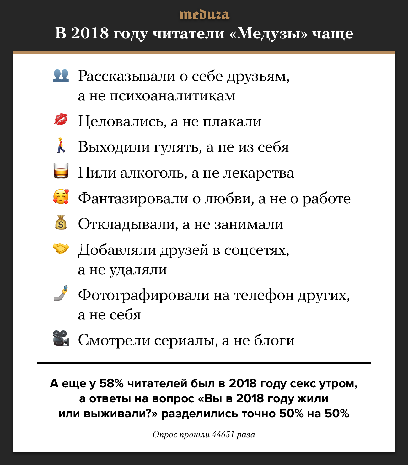 Дата22.12.2018АвторСкрытИсточникМедузаСохранённая копияInternet ArchiveOriginal MaterialShow translationУра, читатели «Медузы» в 2018-м чаще целовались, а не плакали! А что вы еще делали?Результаты опроса Опрос проводился в середине декабря.