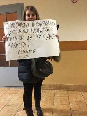 Девушка стояла на Литейном проспекте с плакатом, посвященным Дню чекиста (работника органов безопасности). Задержание полицейские объяснили проверкой плаката на экстремизм.