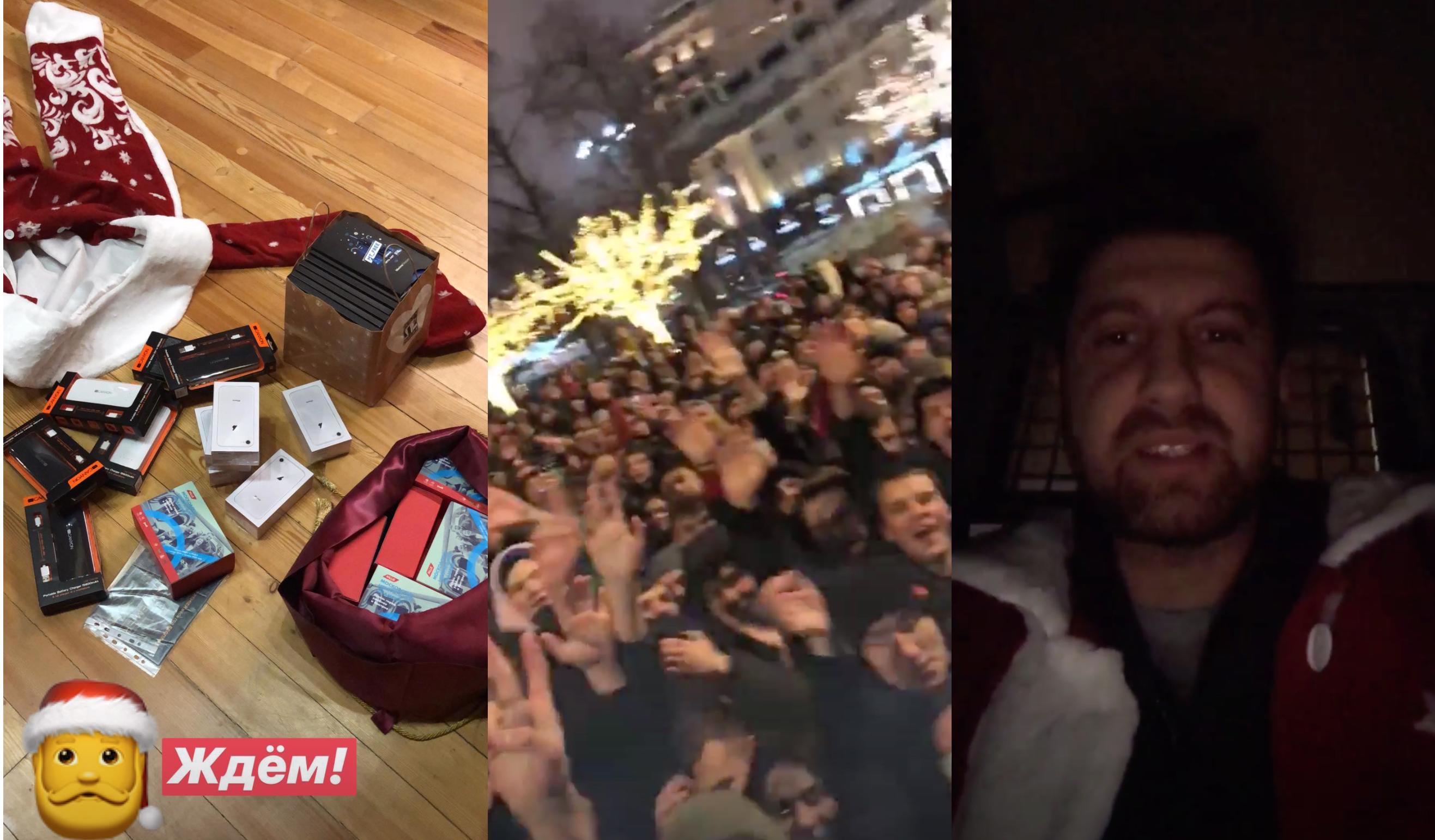 Сегодня днем Сардаров анонсировал в сторис появление у торгового центра «Охотный ряд» «Хача Деда Мороза и Снегурочки» с подарками: айфонами, пауэрбанками и прочими «ништяками». «Кто успеет — тот и заберет. Халява!» — говорил видеоблогер.