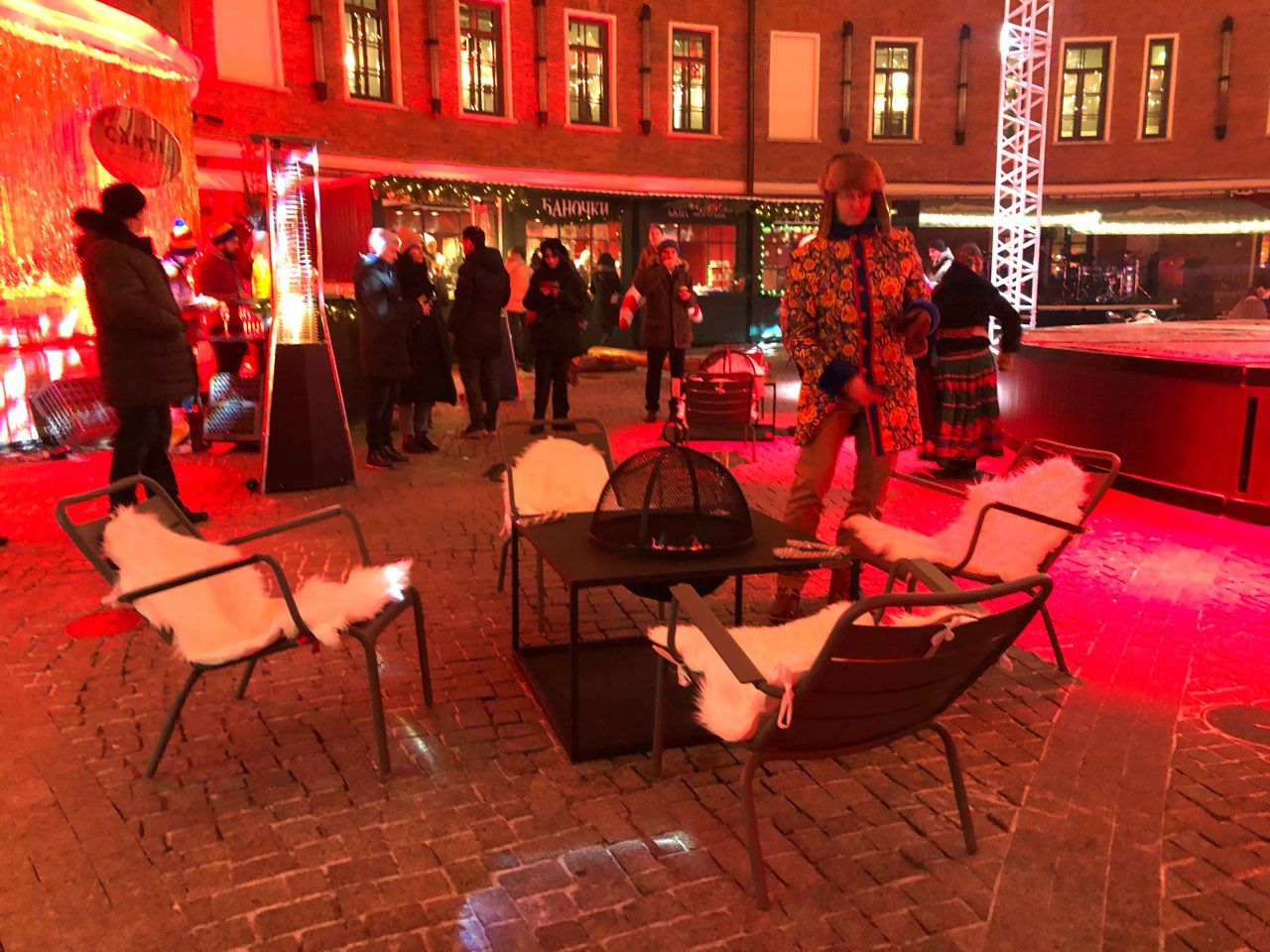Во дворе для посетителей поставили уличные очаги и кресла.