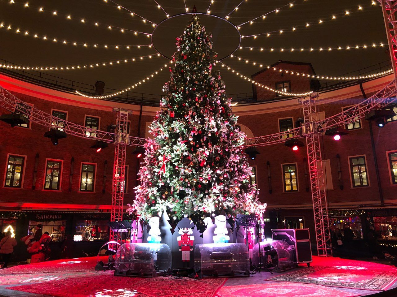А в центре двора установили 8-метровую елку, украшенную праздничными гирляндами.