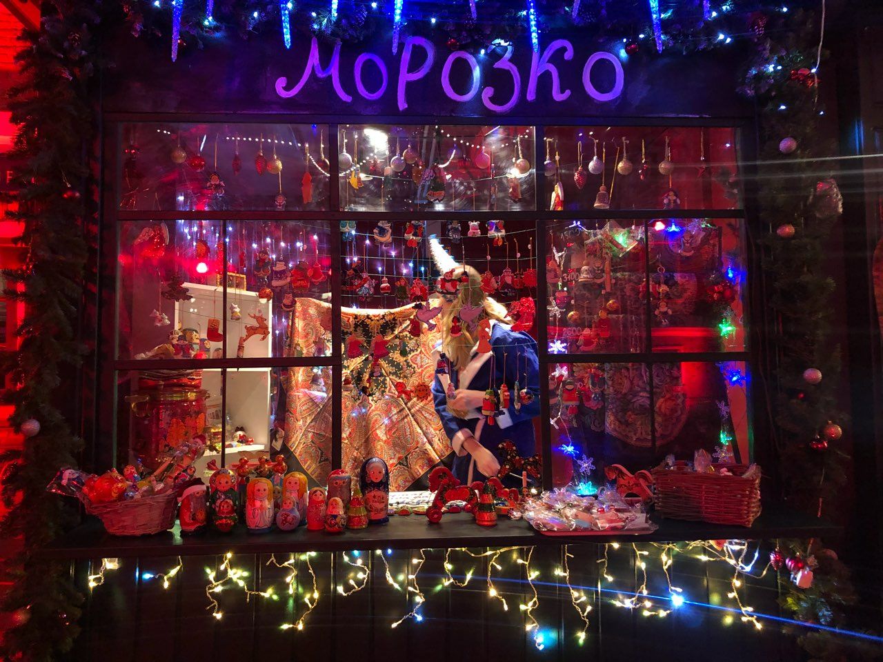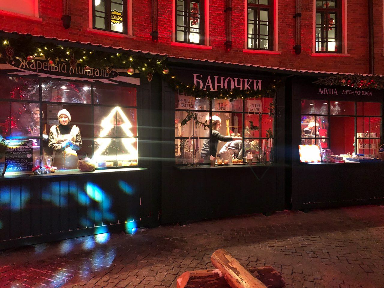 Посмотрите, как выглядит праздничная ярмарка около «Бутылки» вечером 24 декабря — с украшенной елкой и палатками с надписями «Морозко» и «Зеленогорск».