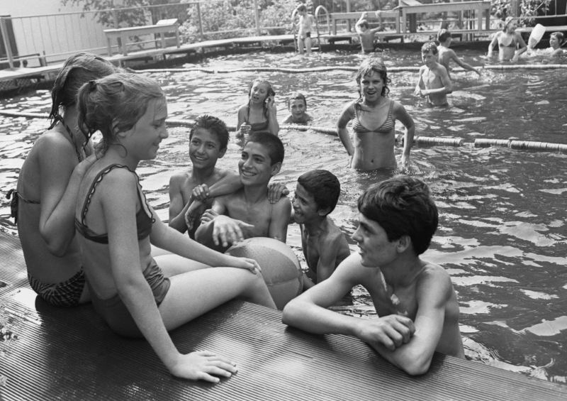 Омская область. Пионерский лагерь «Чайка». Афганские и советские дети в бассейнеФото: Александр Косицин/Фотохроника ТАСС В лагере не было ни реки, ни озера, но детей регулярно возили в бассейн. Никто из афганских детей не умел плавать — в стране гор и пустынь учиться этому негде и незачем: «Каждый из нас, конечно, пытался показать остальным, что все он умеет. Но когда мы увидели, как плавают русские ребятишки, мы поняли — ничего мы не умеем». Ясин поплыл одним из первых, а в старших классах он уже был в группе спасателей — гонял заплывавших за буйки на речке Ахтубе.