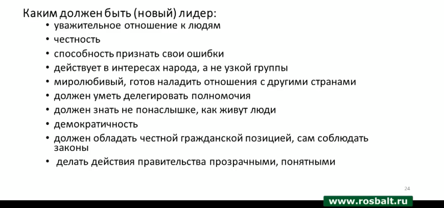 • Запрос на нового лидера. Появился запрос и на «новую модель лидерства». «Интересных лидеров люди не видят, но они описывают, каким хотели бы его видеть <...> новая модель лидерства соответствует их приоритетам и представлениям», — отметил Дмитриев. Качества новых лидеров не совпадают с теми качествами, по которым россияне оценивают Владимира Путина: стабильность, жесткость, личное обаяние и дальновидность: