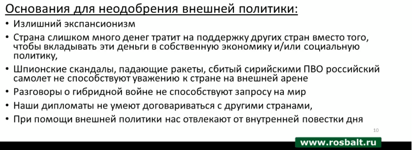 • Недовольство «шпионскими скандалами». Большинство опрошенных (58%) стали менее одобрительно относиться к внешней политике России, которую считают слишком агрессивной. Их не устраивают «шпионские скандалы и падающие ракеты», а также экономическая поддержка других стран: