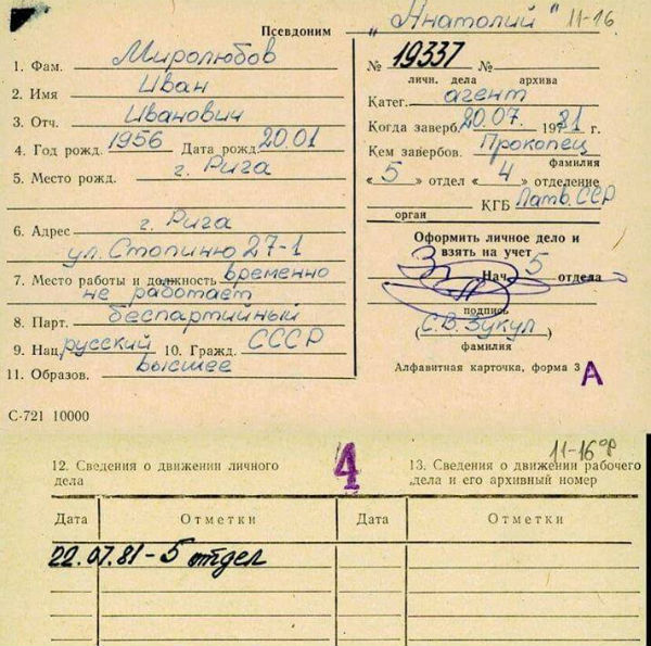 Среди рассекреченных Латвией агентов есть еще один важный персонаж Московской патриархии. Под псевдонимом "Анатолий" (в переводе с греческого - "Восточный") в июле 1981 года офицером по фамилии Прокопец был завербован 25-летний Иван Иванович Миролюбов. Как сказано в агентурной карточке, "временно не работающий". Иван Иванович принадлежал к общине старообрядцев-поморов, владеющей величественным Гребенщиковским храмом в Риге. Руководство КГБ и Совета по делам религий имело на него далекоидущие планы, поскольку для продвижения "борьбы за мир на международной арене по церковной линии" было мало одной Московской патриархии, требовалась некоторая конфессиональная "диверсификация". Просвещенный молодой старообрядец идеально подходил на роль законопослушного советского верующего, патриота, борца за мир, не связанного к тому же со скомпрометированной Московской патриархией.