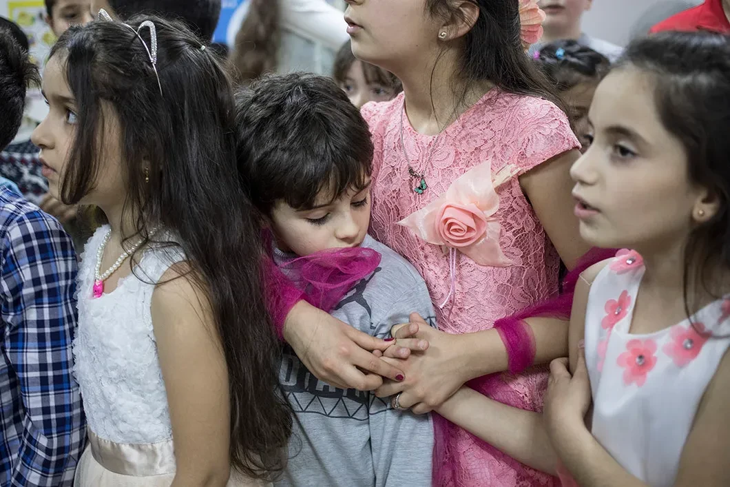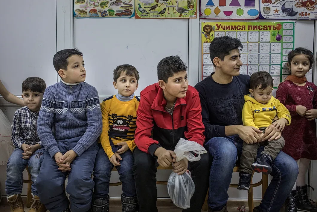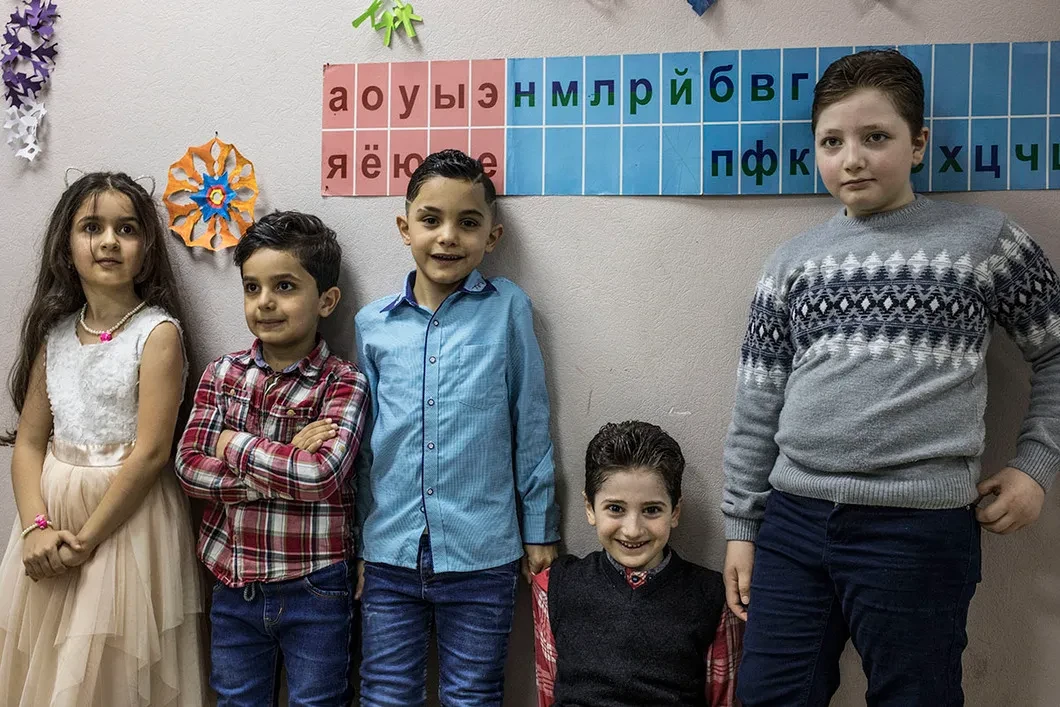 Маленькое офисное помещение в подмосковном Ногинске разрывается от посетителей. В интеграционном центре для детей сирийских беженцев отмечают Новый год. Девочки одеты в праздничные платья. У каждой по большому цветку в волосах, у тех, кто постарше, — на платке. Мальчики с гордо поднятой головой ходят по кабинету в выглаженных рубашках, волосы у них по-взрослому убраны назад с помощью геля. Рядом стоят их мамы: несмотря на духоту, они не снимают свои пуховики — в помещении посторонние — и прячутся от камер. Вокруг суетится, пытаясь собрать разбегающихся детей, преподавательница по арабскому языку Сафа Аль-Кудри — сирийка с добрыми карими глазами и длинной косой.